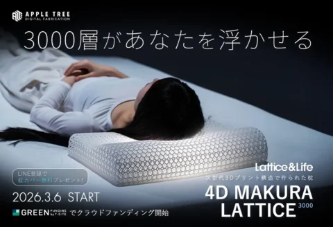APPLE TREE株式会社(大阪府大阪市)は、延期となっていた3Dプリント枕プロジェクトをリニューアルし、「4D MAKURA LATTICE3000」として …