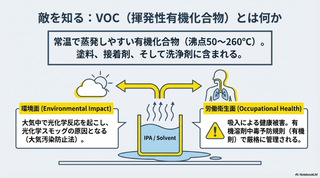 環境面: 大気中で光化学反応を起こし、光化学スモッグの原因となります。大気汚染防止法で排出規制があります。