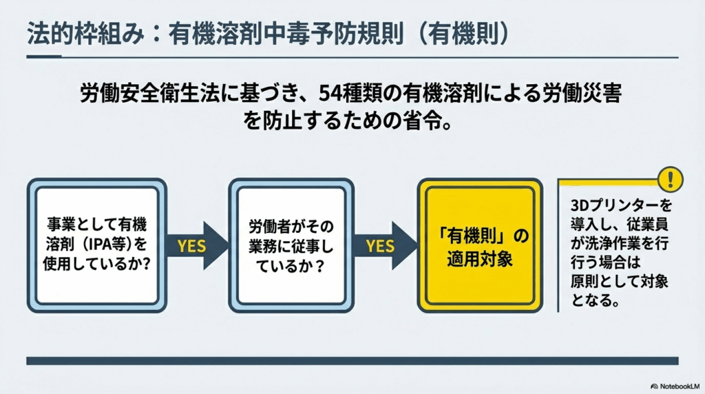 つまり、企業で3Dプリンターを導入し、従業員がIPA洗浄作業を行う場合は有機則の対象となります。