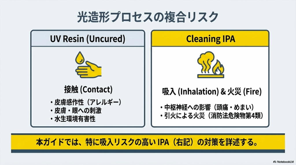 光造形3Dプリンターの普及に伴い、製造現場でのUVレジン洗浄作業が増加しています。洗浄に使用されるIPA(イソプロピルアルコール)は、労働安全衛生法の「有機溶剤中毒予防規則(有機則)」の規制対象物質です。