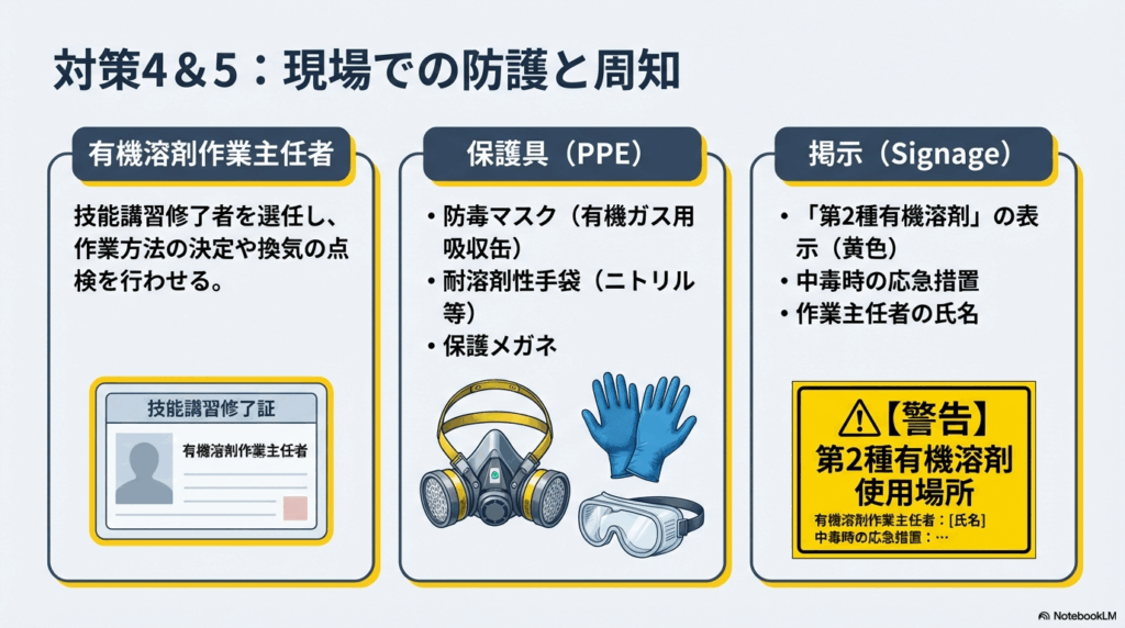 IPAを使用した洗浄作業を行う場合、以下の措置が必要です。