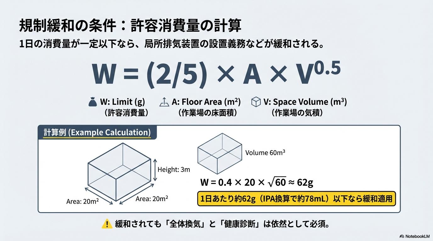 この場合、1日あたり約62g(IPAの比重0.79で換算すると約78mL)以下であれば、局所排気装置の設置義務等が緩和されます。