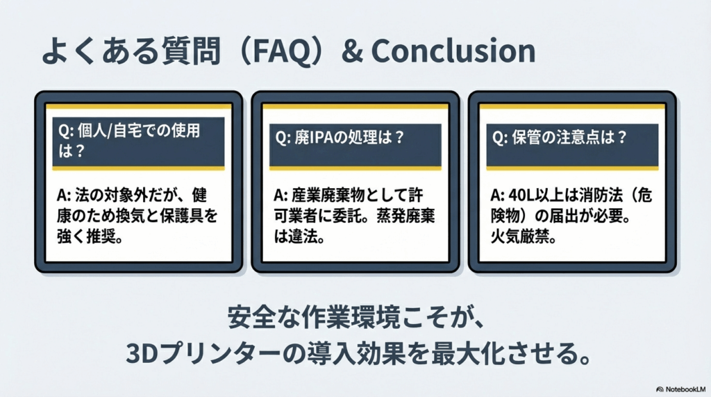 A. 事業者は産業廃棄物として許可業者に委託処理します。レジン成分を含む廃IPAは特に適切な処理が必要です。蒸発させての廃棄は大気汚染防止法違反となる可能性があります。