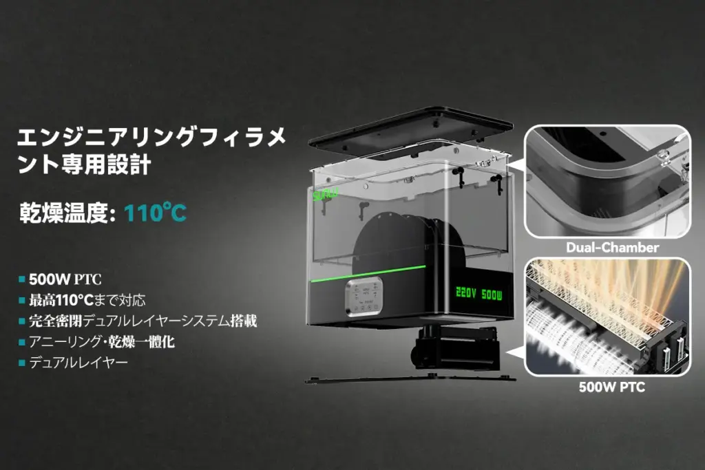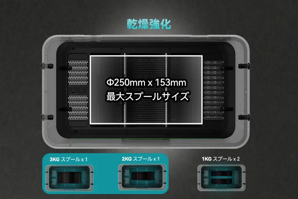- 大容量設計:複数リールや大型フィラメントの利用が可能