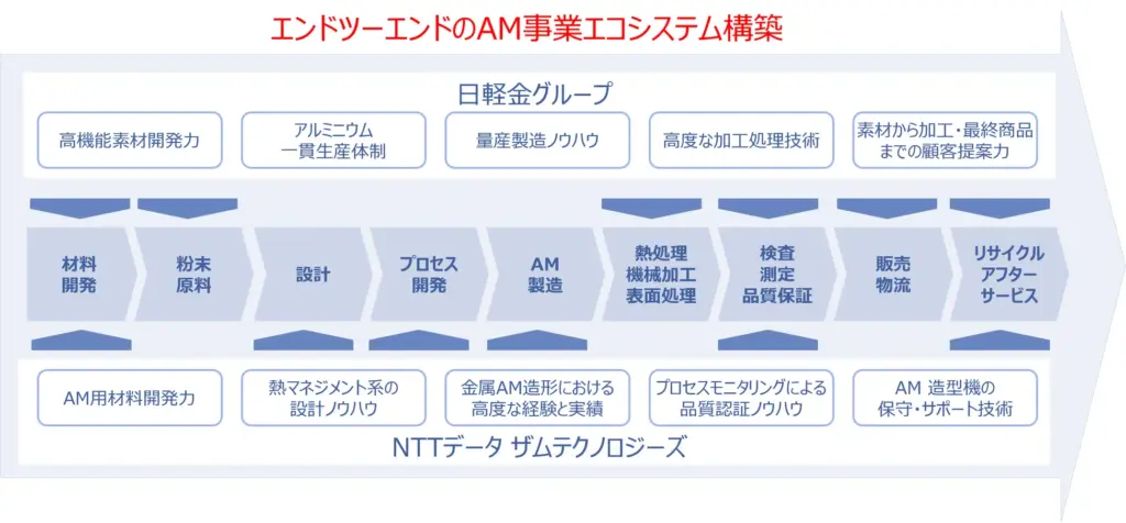株式会社NTTデータ ザムテクノロジーズ(東京都大田区、以下、NTTデータXAM)は、日本軽金属株式会社(東京都港区、以下、日本軽金属)と、金属AM事業に関する戦略的パートナーシップ契約を2024年9月に締結した。本提携により、材料開発から設計、製造、後加工に至るまでの一連の工程を包括するエンドツーエンドのエコシステムを構築し、双方の強みを生かした付加価値の高いサービス提供を目指す。NTTデータXAMは「オールインワンパートナー」として、顧客のAM事業の成長と拡大を支援する体制を強化する。(上部画像はNTTデータXAMのプレスリリースより。出典:NTTデータXAM)