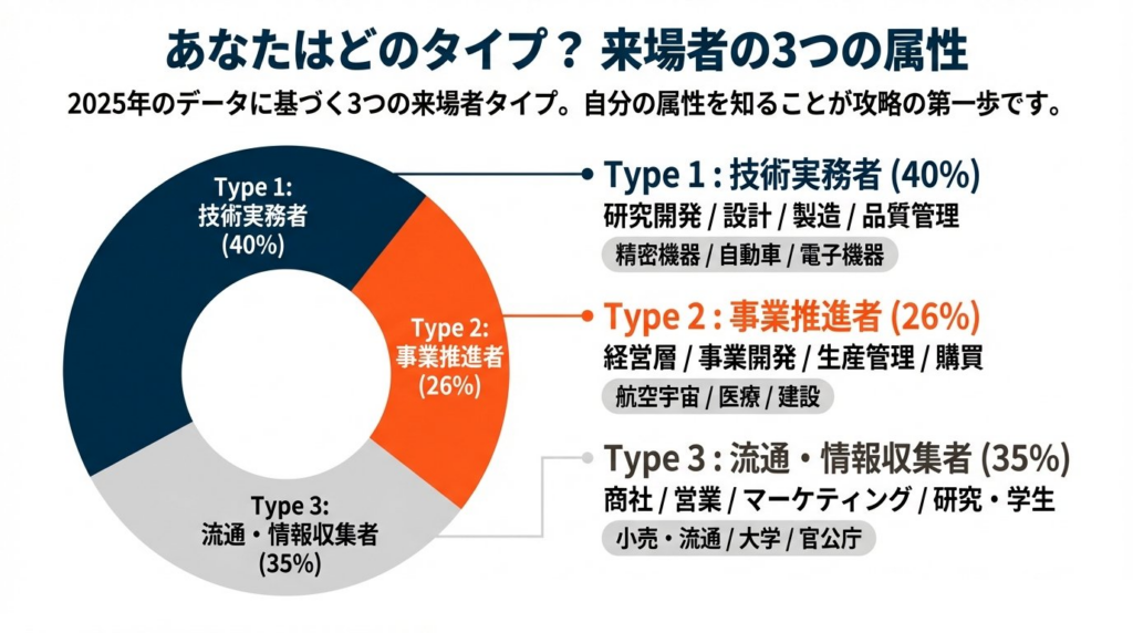 TCT Japan 2025のデータ分析から、来場者は大きく3つのタイプに分類されます。自分がどのタイプに該当するかを把握することで、最適な攻略法が見えてきます。
